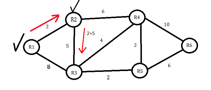 We will now choose the shortest path to the next node, adding the previous value of 2. R2 to R4 is six, so adding 2 would make the total cost 8. If we go to R3 instead, the distance is 5, so 2 plus 5 equals 7. We then conclude that the path to R3 is shorter, so we proceed to the table that corresponds to the shortest distance for R3. Since the distance of 7 is lower than infinity, we will put 7 in the table and R2 as the ‘Previous Node’.