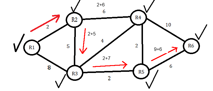 We only have one Node left, but to ensure that we visit all nodes, we will consider the distance from R4 to R6. In this instance, it’s fairly evident that the distance from R5 straight to R6 is a shorter distance when we add our total of 9 and then 6 to make 15. This is shorter than R5 to R4, which is 2 plus 9, and then adding 10, going from R4 to R6 to make 21.