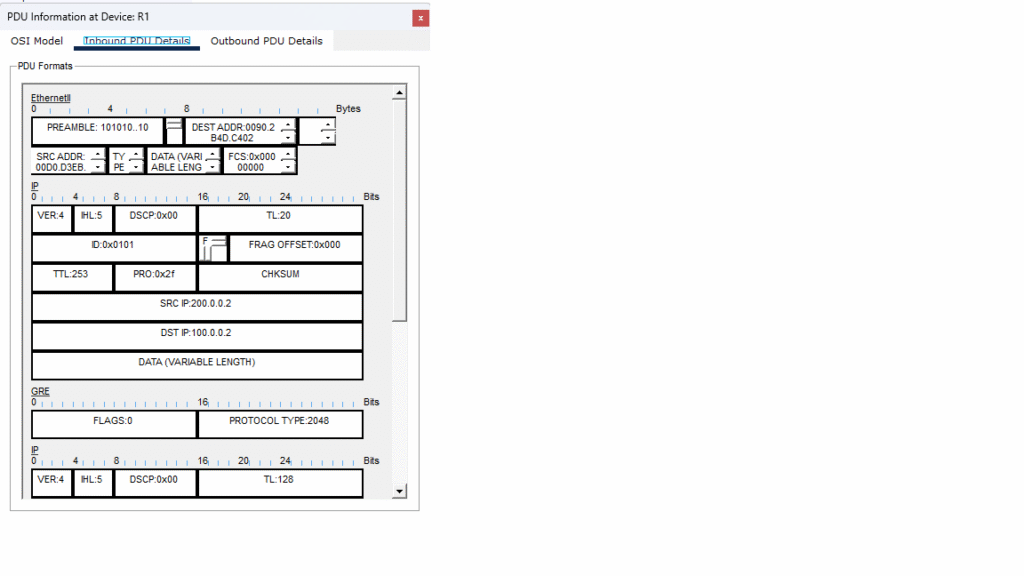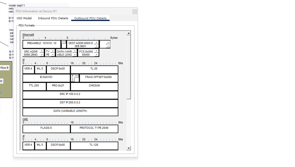 In the above images, I took snapshots of the frames as they reach R1 and R4 inbound and outbound on the configured interfaces. Outbound is when the ethernet frame goes from a device in Office 1 to R1 and from Office 2 to R4. Inbound is when Office 1 sends a frame and R4 has it inbound for Office 2. The opposite is true with inbound frames on R1. i performed a ping test in Packet Tracer to capture traffic as they traverse the GRE tunnel. Above you can see a GRE header below the IP header in the outbound frame, you can see the source and destination IP addresses as they correspond to the source interface F0/0 with 100.0.0.2 on R1 and destination interface F0/1 with 200.0.0.2 on R4. The inbound frame has the source and destination IP addresses reversed. This setup is not ideal as it is unencrypted and would typically use a protocol called IPsec to prevent the compromising of data across the internet.