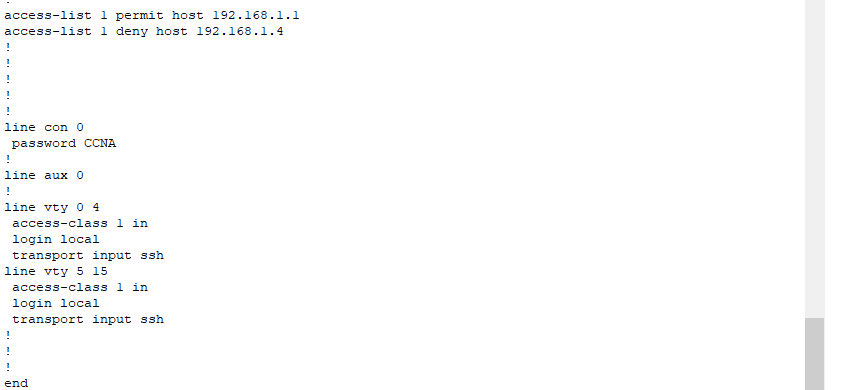 I will need the same password when going to user exec mode and beyond. To ensure the access control lists I created apply, I used the command ‘access-class 1 in’. SSH requires permission to work on R1, so the command ‘transport inut ssh’ should be placed at the end of the list of commands. To log into R1, I will open the command prompt on one of the PCs and type ‘ssh -l admin 192.168.1.3’. This is fine for a router, but layer two switches don’t have IP addresses. In this case, I created an IP address on the switch in a few steps. Once we do this, we can SSH into the switch in the same way as with the router. We first have to go to a Virtual LAN with the command ‘ int Vlan1’. This command enables us to assign an IP address to the VLAN on the switch. From here, we specify the IP address on the switch as 192.168.1.2. For the switch to work in conjunction with SSH, we need to specify the IP address of the default gateway, or in this case, R1, with the command ‘ip default-gateway’. On SW1, I configured my ACLs to be the opposite of R1, where PC4 is permitted for SSH, but PC1 isn’t. The rest of the SSH configurations are the same.