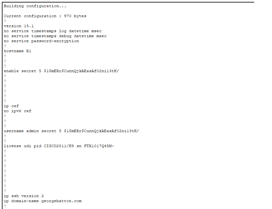 In this case, I granted access to PC1 via its IP address, 192.168.1.1, and denied access to PC4 at 192.168.1.4. To enter SSH configuration mode, we need to specify the VTY lines. I will allow lines 0-15, which allows up to 16 users to SSH into the device and view information. Only one user is allowed to make changes at a time. To enter this mode, we type ‘line vty 0 15’. To create the security keys necessary for the encryption tunnel between the server and client, we first need to create a hostname for the device. For this, I changed the default name ‘Router1’ to ‘R1’. I also made the domain name georgebatton.com. The running-configuration shows the commands I used to make this happen.