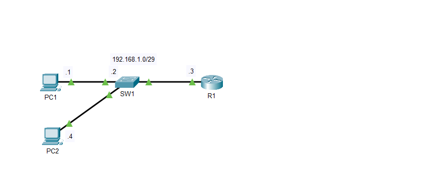 SW1 is set up with an ACL permitting access to PC2 but denying access to PC1 which is the opposite of how it is configured on R1. Since the switch isn’t a layer 3 device a vlan must be created to set up and IP address. As long as the subnet allows for the additional IP address this is a viable way to communicate with Layer 2 devices. With a /29 prefix we are allowed up to six usable hosts with two bits left over for the network and broadcast address. The command default-gateway 192.168.1.3 is necessary on the switch to point back to R1 for reference.